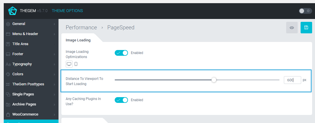 TheGem includes one very useful feature, allowing you to enable the image loading on your webpages in a smart way. In common terms it is a lazy loading of media resources upon arrival of the browser/device viewport. In this way, by loading your webpage, all images below the fold (which are not immediately displayed for user) are physically not loaded. And only by scrolling down the page, as soon as this images appear in above the fold area they are being loaded and displayed. In order to avoid any unpleasent loading interruptions, there is a special “buffer” zone below the fold, which enables the image loading some pixels before this images appear in above the fold area. You can enable and set this feature in TheGem here: